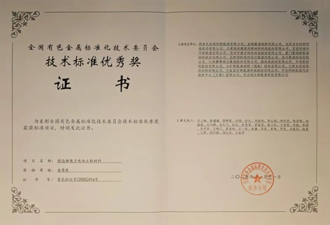 近日,全國有色金屬標(biāo)準(zhǔn)化技術(shù)委員會對2025年度技術(shù)標(biāo)準(zhǔn)優(yōu)秀獎進(jìn)行表彰,由五礦新能子公司長遠(yuǎn)新能源牽頭制定的行業(yè)標(biāo)準(zhǔn)《固態(tài)鋰離子電池正極材料》,榮獲“全國有色金屬標(biāo)準(zhǔn)化技術(shù)委員會技術(shù)標(biāo)準(zhǔn)優(yōu)秀獎三等獎”。